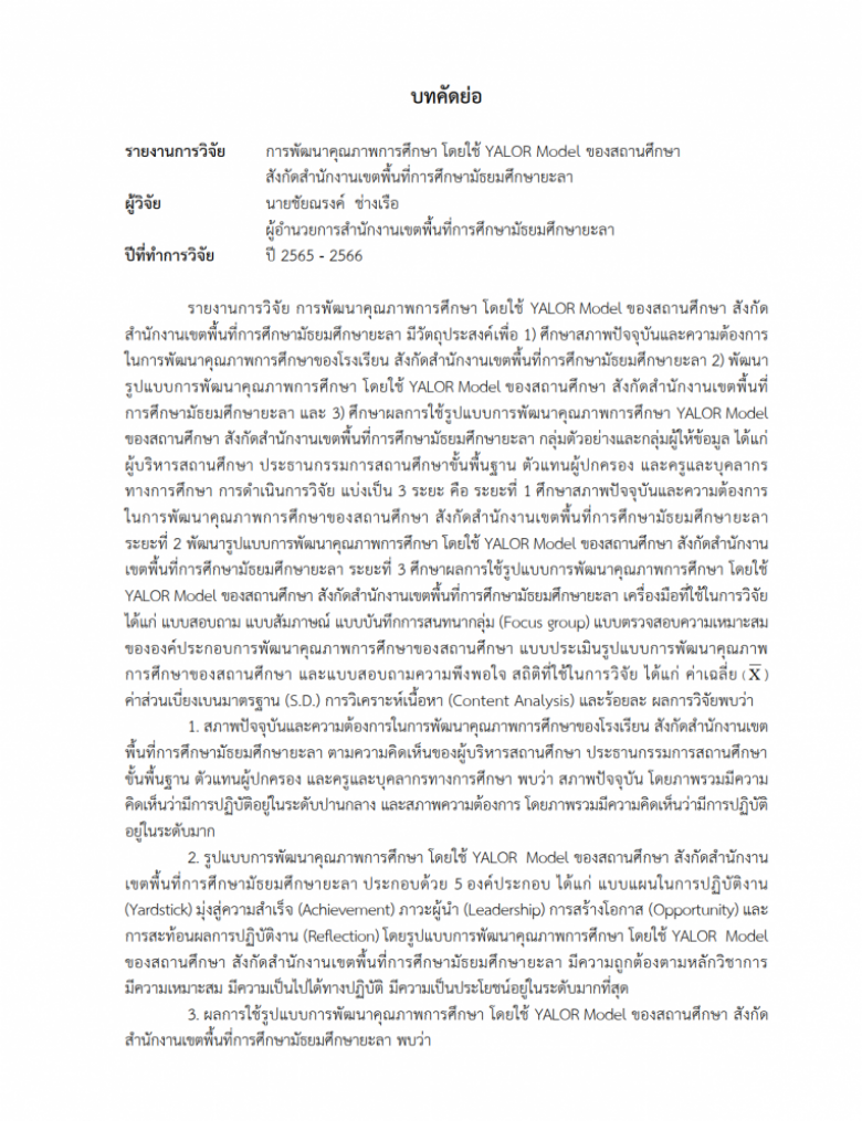 รายงานการวิจัย การพัฒนาคุณภาพการศึกษา โดยใช้ YALOR Model ของสถานศึกษา ... (ดู : 1,212)