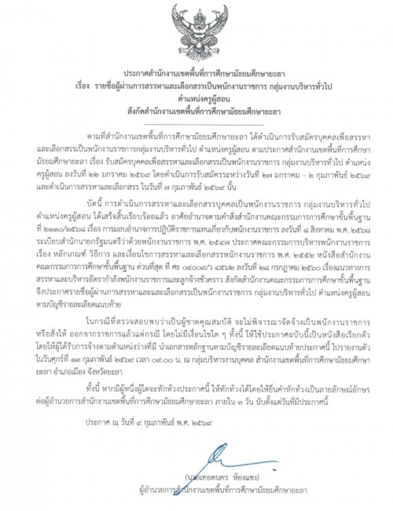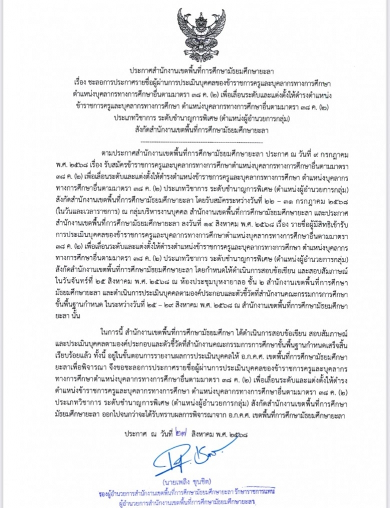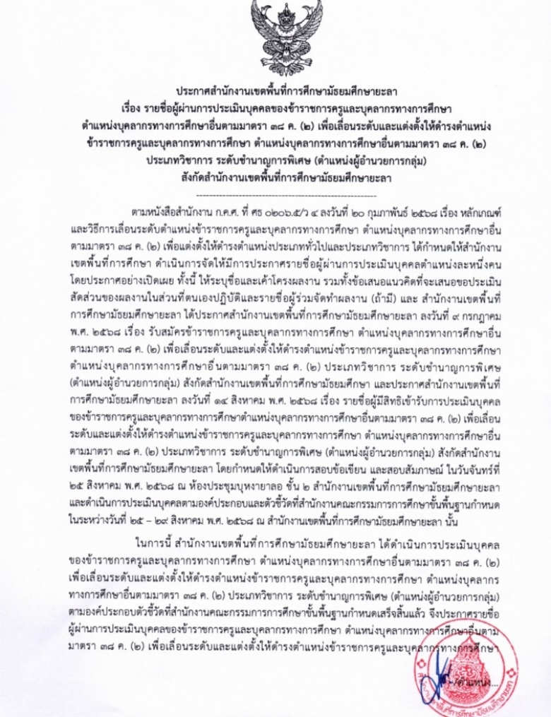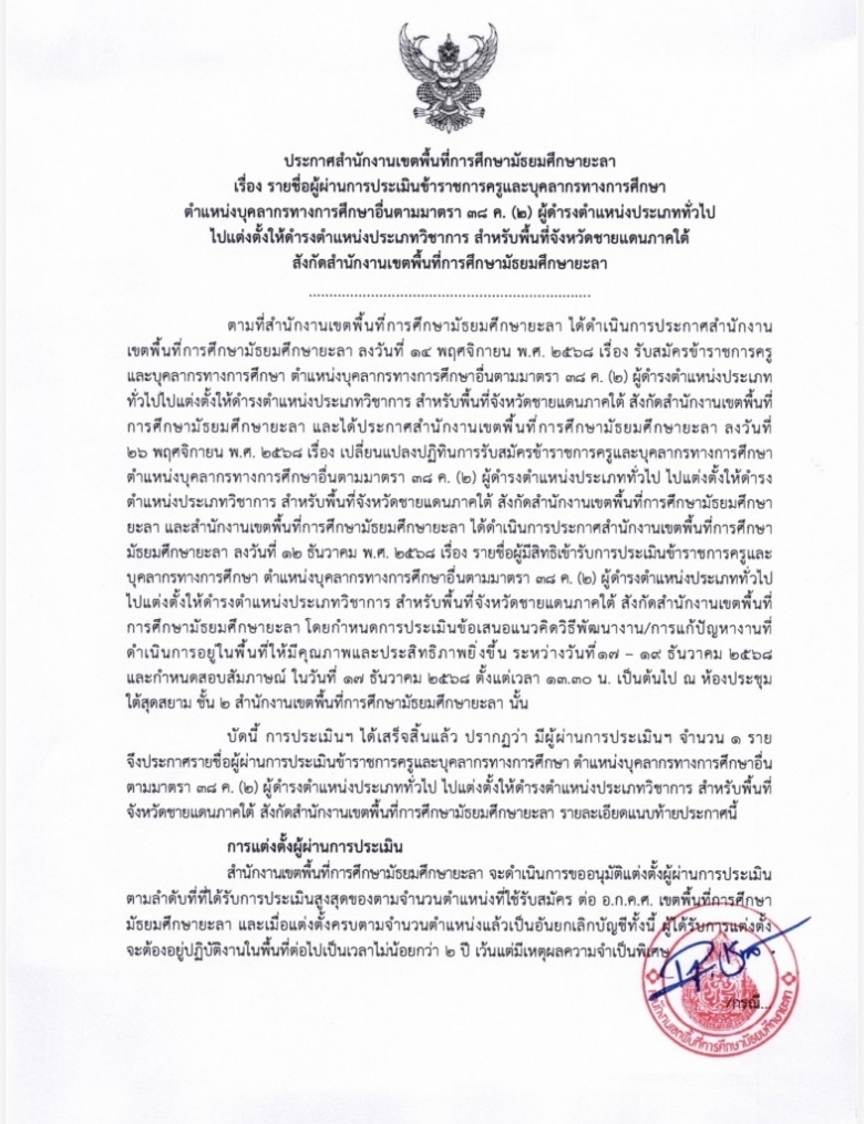 ประกาศสำนักงานเขตพื้นที่การศึกษามัธยมศึกษายะลา เรื่อง รายชื่อผู้ผ่านก... (ดู : 137)