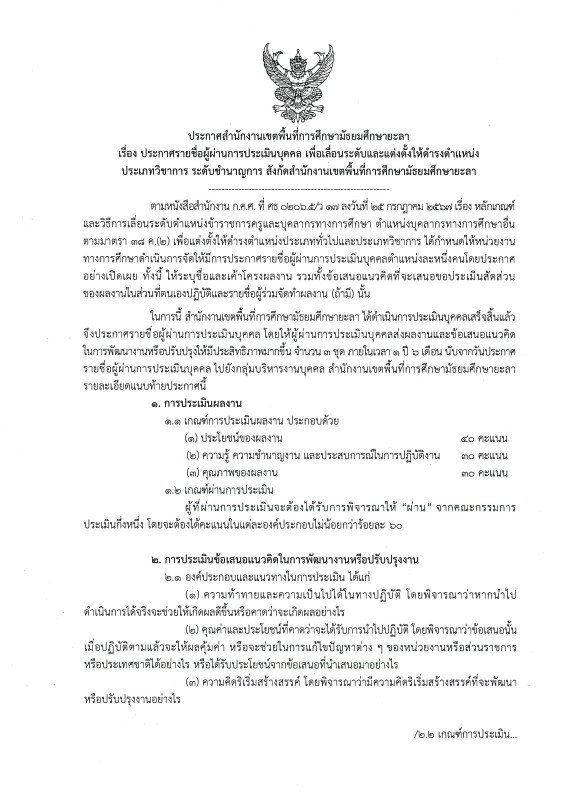 ประกาศ สพม.ยะลา เรื่อง ประกาศรายชื่อผู้ผ่านการประเมินบุคคล เพื่อเลื่อนระดับและแต่งตั้งให้ดำรงตำแหน่ง ประเภทวิชาการ ระดับชำนาญการ สังกัด สพม.ยะลา