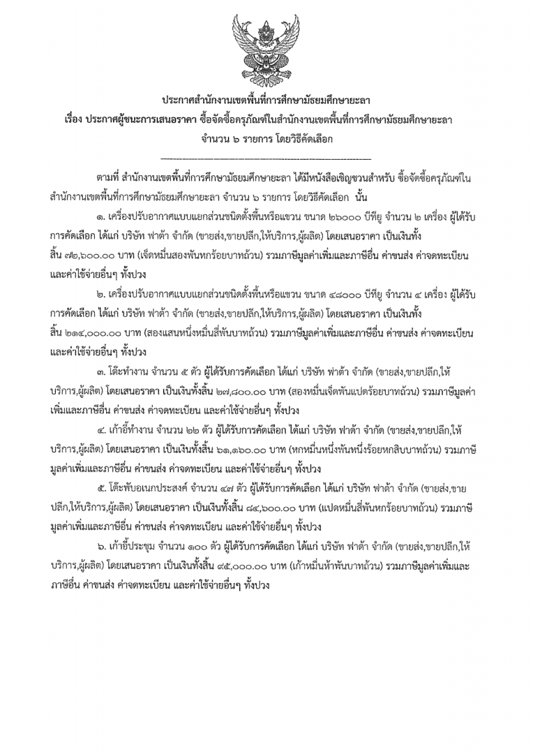 ประกาศผู้ชนะการเสนอราคา จัดซื้อครุภัณฑ์ในสำนักงานเขตพื้นที่การศึกษามัธยมศึกษายะลา จำนวน 6 รายการ