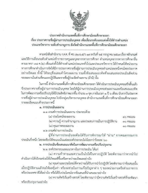 ประกาศ สพม.ยะลา เรื่อง ประกาศรายชื่อผู้ผ่านการประเมินบุคคล เพื่อเลื่อนระดับและแต่งตั้งให้ดำรงตำแหน่ง ประเภทวิชาการ ระดับชำนาญการ สังกัด สพม.ยะลา