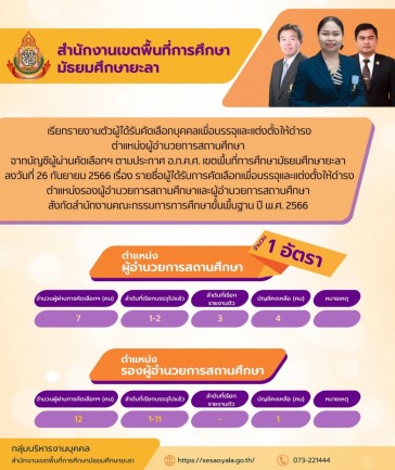 สำนักงานเขตพื้นที่การศึกษามัธยมศึกษายะลา เรียกรายงานตัวผู้ได้รับคัดเลือกบุคคลเพื่อบรรจุและแต่งตั้งให้ดำรงตำแหน่งผู้อำนวยการสถานศึกษา จำนวน 1 อัตรา จากบัญชีผู้ผ่านคัดเลือกฯ ตามประกาศ อ.ก.ค.ศ. เขตพื้นที่การศึกษามัธยมศึกษายะลา ลงวันที่ 26 กันยายน 2566 เรื่อง รายชื่อผู้ได้รับการคัดเลือกเพื่อบรรจุและแต่งตั้งให้ดำรงตำแหน่งรองผู้อำนวยการสถานศึกษาและผู้อำนวยการสถานศึกษา สังกัดสำนักงานคณะกรรมการการศึกษาขั้นพื้นฐาน ปี พ.ศ. 2566