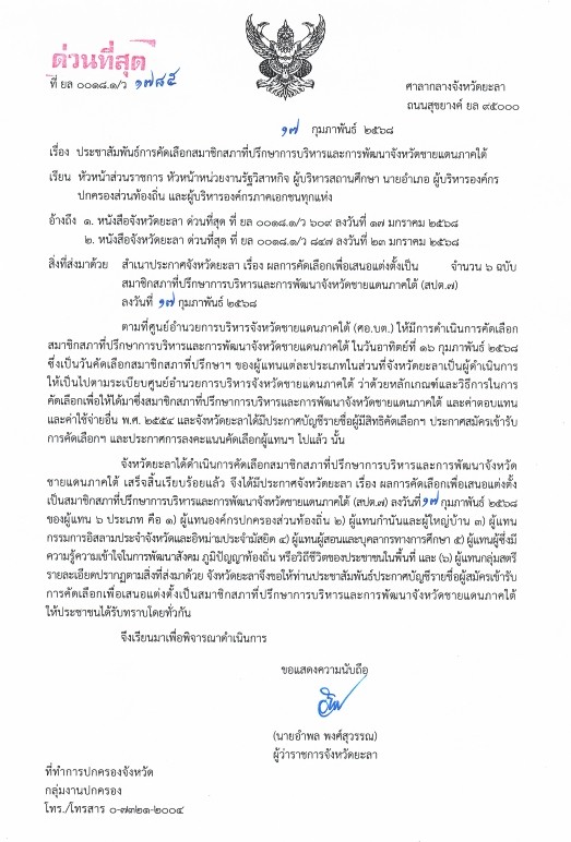 ผลการคัดเลือกเพื่อเสนอแต่งตั้งเป็นสมาชิกสภาที่ปรึกษาการบริหารและการพัฒนาจังหวัดชายแดนภาคใต้ (สปต.๗) ลงวันที่ ๑๗ กุมภาพันธ์ ๒๕๖๘