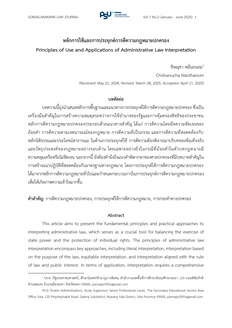 ผลงานวิชาการตีพิมพ์ในวารสาร TCI กลุ่มที่ 2 ของ ดร.ชิษณุชา หมั่นถนอม เรื่อง หลักการใช้และการประยุกต์การตีความกฎหมายปกครอง