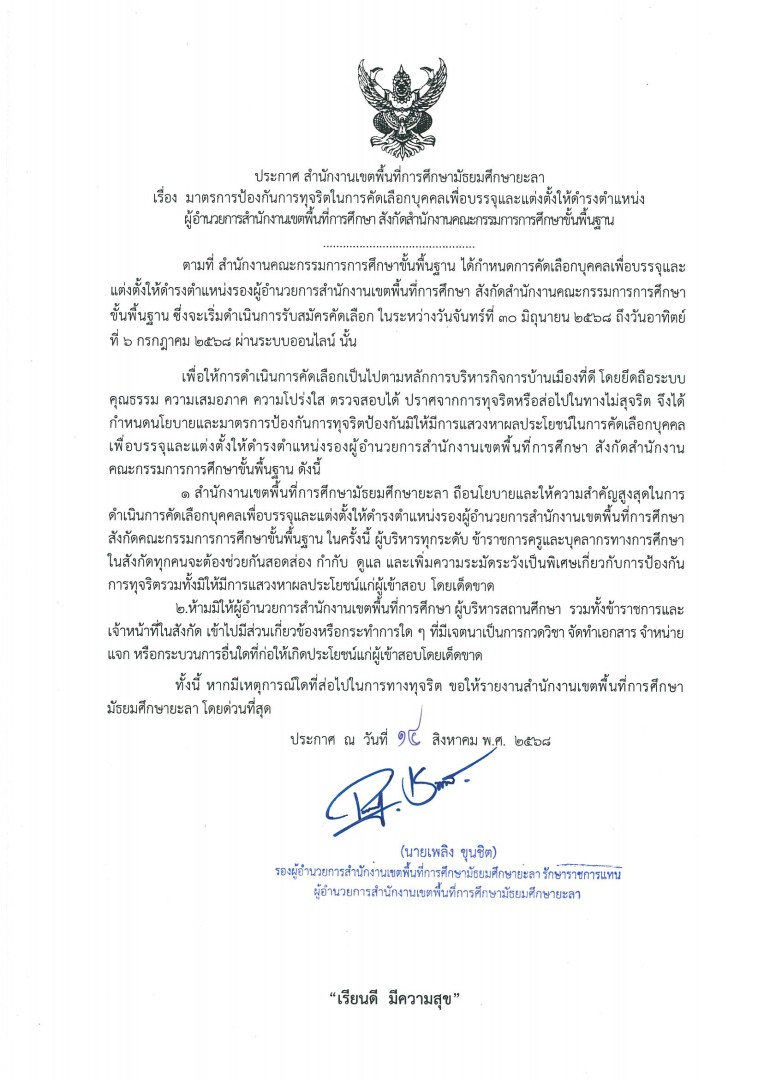 ประกาศ สพม.ยะลา เรื่อง มาตรการป้องกันการทุจริตในการคัดเลือกบุคคลเพื่อบรรจุและแต่งตั้งให้ดำรงให้ตำแหน่ง ผู้อำนวยการสำนักงานเขตพื้นที่การศึกษา สังกัดสำนักงานคณะกรรมการการศึกษาขั้นพื้นฐาน
