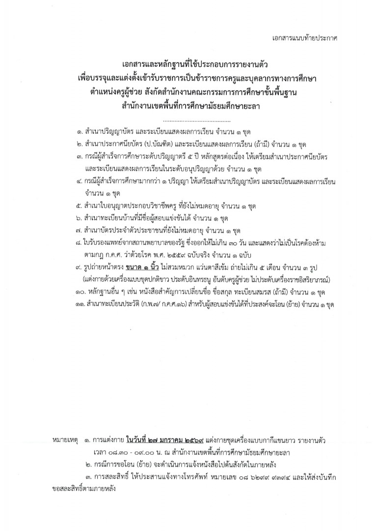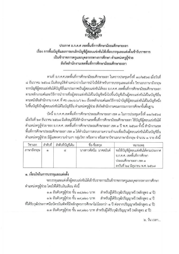 ประกาศ อ.ก.ค.ศ.เขตพื้นที่การศึกษามัธยมศึกษายะลา เรื่อง การขึ้นบัญชีและการยกเลิกบัญชีผู้สอบแข่งขันได้เพื่อบรรจุและแต่งตั้งเข้ารับราชการเป็นข้าราชการครูและบุคลากรทางการศึกษา ตำแหน่ง ครูผู้ช่วย สังกัดสำนักงานเขตพื้นที่การศึกษามัธยมศึกษายะลา