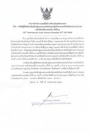 ประกาศสำนักงานเขตพื้นที่การศึกษามัธยมศึกษายะลา เรื่อง รายชื่อนักเรียนผู้มีสิทธิสอบคัดเลือกผู้แทนประเทศไทยไปแข่งขันวิทยาศาสตร์โอลิมปิกระหว่างประเทศ ระดับมัธยมศึกษาตอนต้น ครั้งที่ 23 รอบที่ 1 จำนวน 191 คน สนามสอบ ณ โรงเรียนคณะราษฎรบำรุง จังหวัดยะลา อำเภอเมืองยะลา จังหวัดยะลา (รายชื่อตามบัญชีแนบท้ายนี้) กำหนดการสอบคัดเลือกผู้แทนประเทศไทยไปแข่งขันวิทยาศาสตร์โอลิมปิกระหว่างประเทศ ระดับมัธยมศึกษาตอนต้น ครั้งที่ 23 รอบที่ 1 ในวันอาทิตย์ที่ 18 มกราคม 2569 ให้ผู้เข้าสอบรายงานตัว ณ ห้องสอบเวลา 07.30 – 07.45 น. เริ่มสอบเวลา 08.30 - 16.10 น.